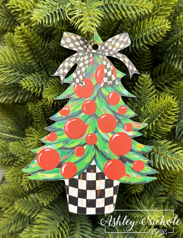 Christmas Tree - CHECKERED Bow - Wooden Christmas Ornament