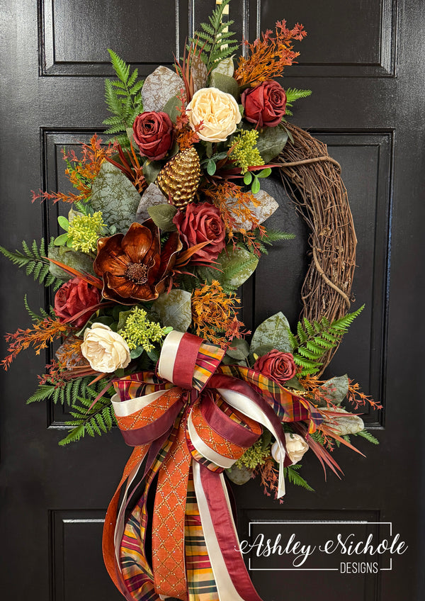 Fall Magnolia & Wine Roses Wreath
