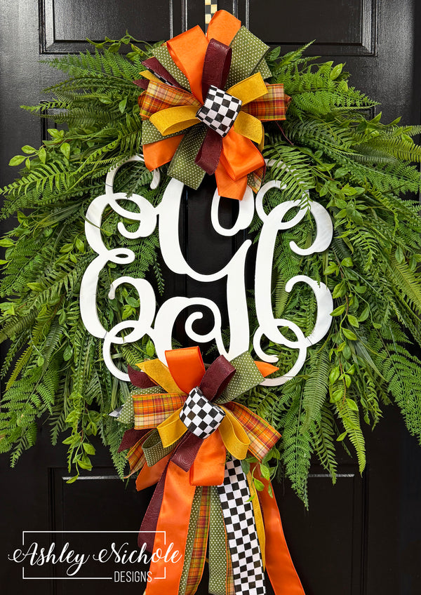 Wreath is handmade and occasionally same color/style substitutions could be made for supplies & ribbons. Letters are 1/4" thick x 18" tall