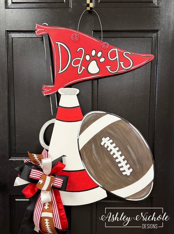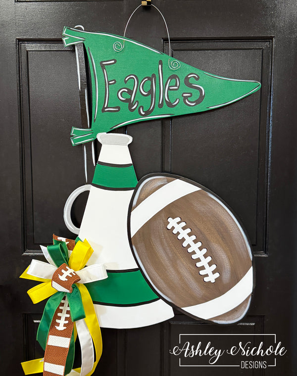 This wooden door hanger is customized for you! Handmade in Mount Olive, NC our door hangers are made from 1/4" thick wood and painted with outdoor paint. They are black on the back & hung with a metal wire for a polished look. Bow included.