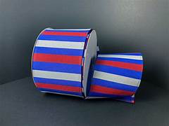 Horizontal Stripes, Red & White on Blue Wired Ribbon 2.5” x 10yds