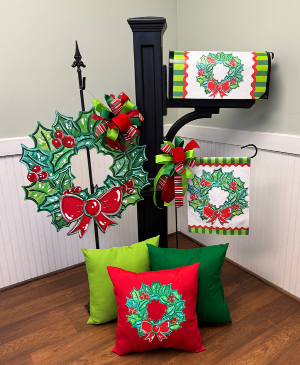 Custom Pillow - Christmas Holly Wreath - on Red Outdoor Fabric