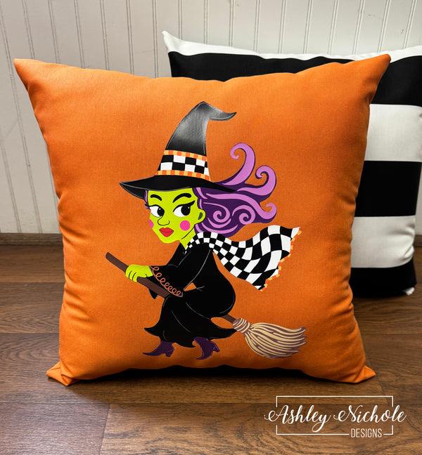 Custom Pillow - Toil & Trouble Sassy Witch on Mandarin Orange Outdoor Fabric