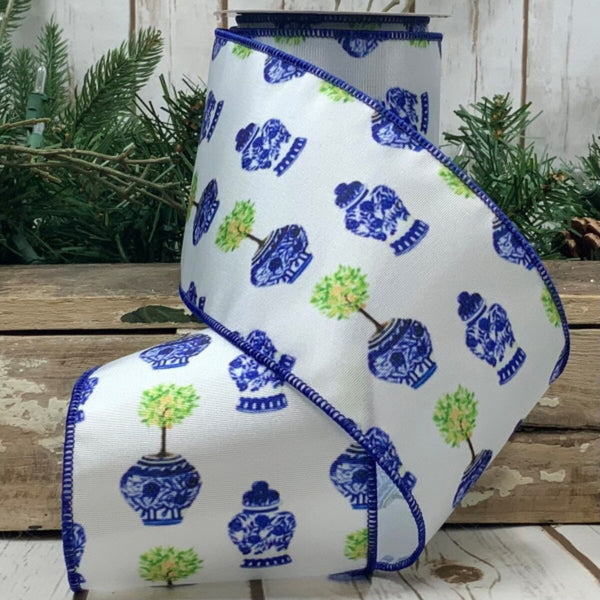 Blue & White Grosgrain Printed Urns Wired Ribbon - 4" x 10yds