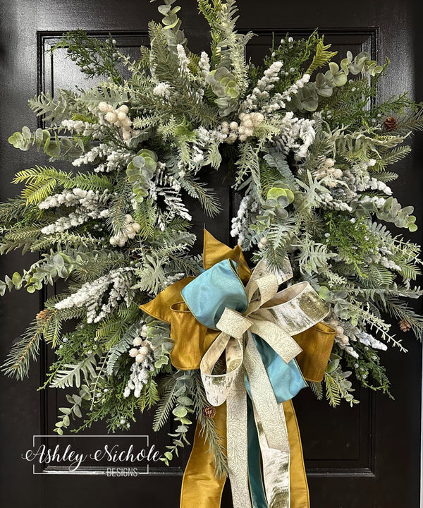 Made on a 18" round grapevine wreath (approximate measurement of the wreath from tip to tip of greenery - 34" round, dimensions do not include the ribbon streamers)